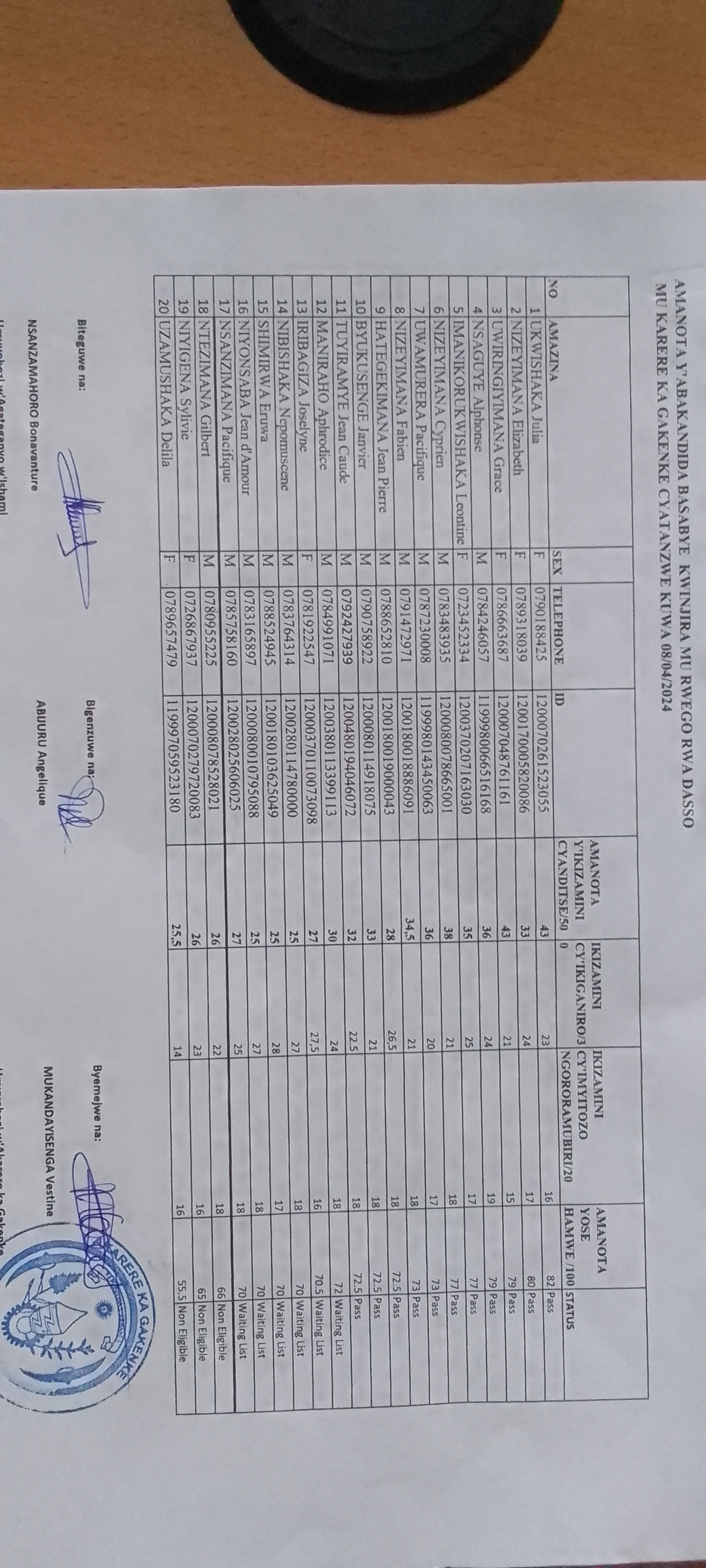 AMANOTA Y'ABATSINZE IKIZAMINI CYANDITSE (Written) N'IKIZAMINI CY'IKIGANIRO (Interview) KU MWANYA WA DAF W'BITARO BYA NEMBA Na HEAD OF HEALTH CENTER (NEMBA,JANJA)