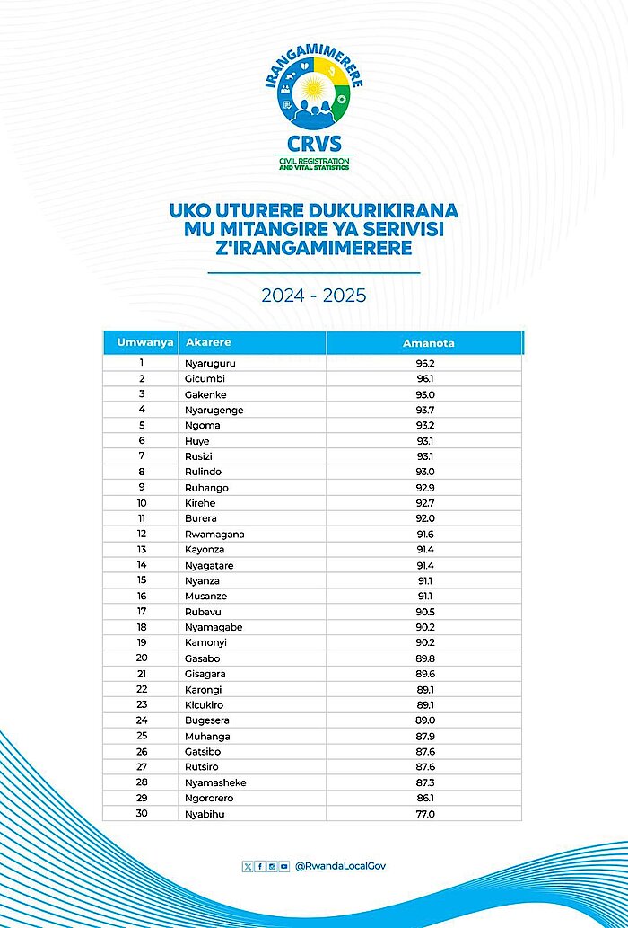Akarere ka Gakenke kabaye Aka gatatu muri serivisi z’Irangamimerere n’amanota 95.0% gakurikira aka Nyaruguru kabaye aka Mbere n’amanota 96.2% na Gicumbi kaje ku mwanya wa Kabiri n’amanota 96.1%.