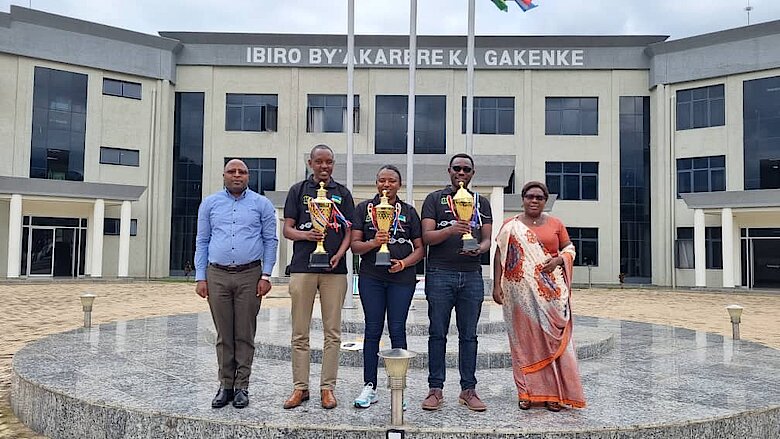 Umuyobozi w'Akarere ka Gakenke ashyikiriza Umunyamabanga Nshingwabikorwa w'Umurenge wa Cyabingo igihembo