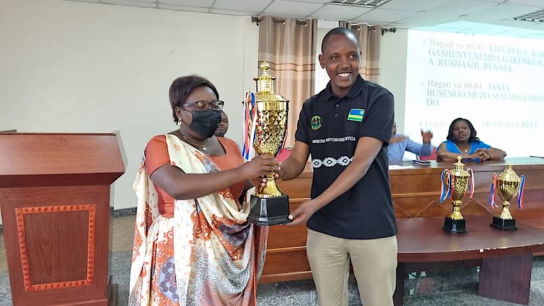 Umuyobozi w'Aarere wungirije ushinzwe Imibereho myiza y'abaturage ashyikiriza Umunyamabanga Nshingwabikorwa w'Umurenge wa Muyongwe igihembo