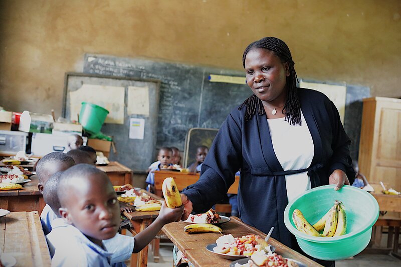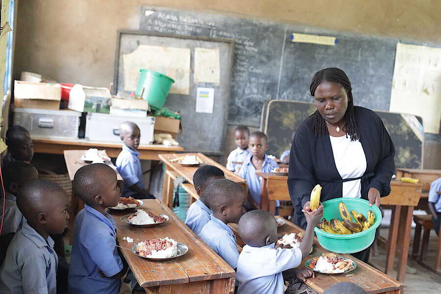●Akamaro k'ifunguro abana bafatira ku ishuri [Kugabanya umubare w'abana bata ishuri, abakererwa n'abasiba, gufata amafunguro arimo intungamubiri, kubona umwanya go gusubira mu masomo].